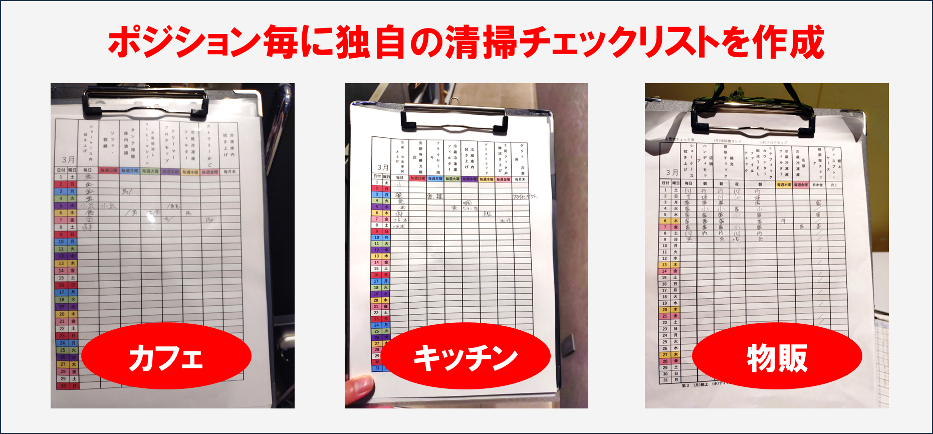 ここでは自分の意志だけでなく、実際に行うスタッフの声も聞き入れることにより、やりやすい表を作成することを特に意識しました。 チェックシートの型が定まり、次に起こった問題は「記入漏れ」です。 未記入=やっていない認識のため、知らずにほかのスタッフがもう1度行うという2度手間が起こってしまうのです。改善案としてチェックシートの回収を行うようにしました。打刻機横に毎日営業終了後に回収、早番メンバーが出勤時に各セクションに配布の流れを作ることにより記入漏れがなくなりました。 【2】「指摘事項」は 即改善アウトレットの衛生検査が年5回、深谷市保健所の検査が年1回、ブランド本部様の臨店チェックが2週間に1回の頻度で行っていただいております。 フィードバックを頂いたらその日の内に改善、共有を行いチェック表の更新も1週間以内に行います。 また、毎月の店会議では、強化ポイントの進捗報告を行ってきました。 |