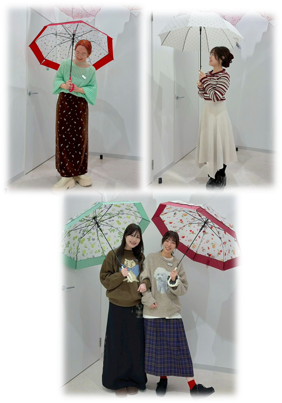 「傘のデザイン、洋服とのコーディネートなどをリアルで見て頂きたい!」という思いから、店内で傘を差して動的待機を行い始めました!